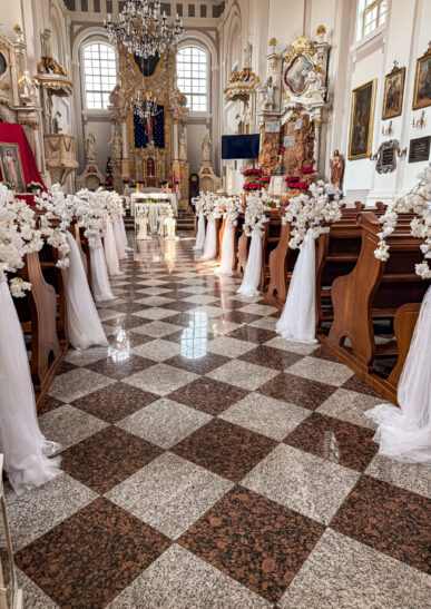 Oferujemy eleganckie dekoracje kościelne, od kwiatów po biały dywan, w pełni dopasowane do Waszej ceremonii.